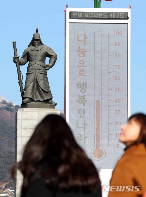 【서울=뉴시스】전신 기자 = 크리스마스인 25일 서울 광화문광장에 설치된 사랑의 온도탑이 목표액 절반에도 못 미치는 40.7도를 가리키고 있다. 2017.12.25. [email protected]