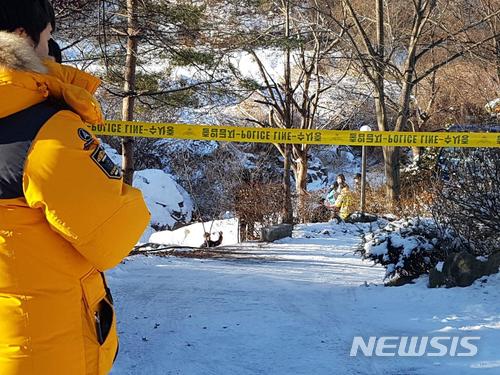 【춘천=뉴시스】고성호 기자 = 26일 오전 8시34분께 강원 춘천시 사북면 고성리 한 모텔 인근 하천으로 차량이 추락해 경찰이 사고 경위를 조사 중이다.2017.12.26