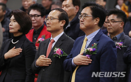 【서울=뉴시스】박영태 기자 = 26일 서울 영등포구 여의도 국회에서 진행된 제3회 자원순환사회 실현을 위한 대토론회(생활폐기물 재활용 활성화 방안)에서 우원식(오른쪽부터) 더불어민주당 원내대표와 홍영표 국회 환노위원장, 한정애 의원 등 참석자들이 국민의례를 하고 있다. 2017.12.26.