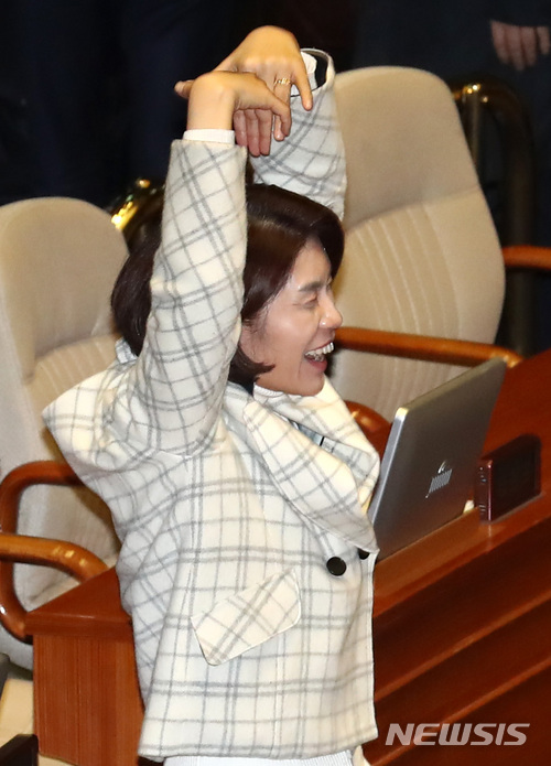 【서울=뉴시스】이영환 기자 = 29일 오후 서울 여의도 국회 본회의장에서 열린 제355회 국회(임시회) 제1차 본회의에서 정세균 국회의장이 산회를 선포하자 더불어민주당 한정애 의원이 정 의장에게 하트를 보내고 있다. 2017.12.29.