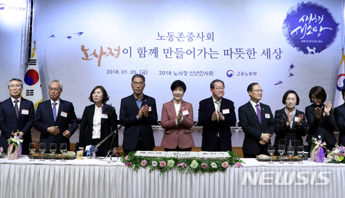 【서울=뉴시스】조성봉 기자 = 5일 오후 서울 중구 포스트타워에서 열린 노사정 신년인사회에서 김영주 고용노동부 장관을 비롯한 참석자들이 박수를 치고 있다.