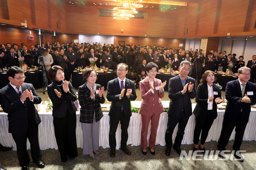 【서울=뉴시스】조성봉 기자 = 5일 오후 서울 중구 포스트타워에서 열린 노사정 신년인사회에서 김영주(왼쪽 다섯 번째) 고용노동부 장관을 비롯한 참석자들이 박수를 치고 있다. 왼쪽부터 더불어민주당 서형수 의원, 한정애 의원,한무경 여성경제인연합회 회장, 홍영표 국회 환노위원장, 김영주 장관, 김주영 한국노총 위원장, 박찬재 여성경총회장,강호갑 중견기업연합회 회장. 2018.01.05.