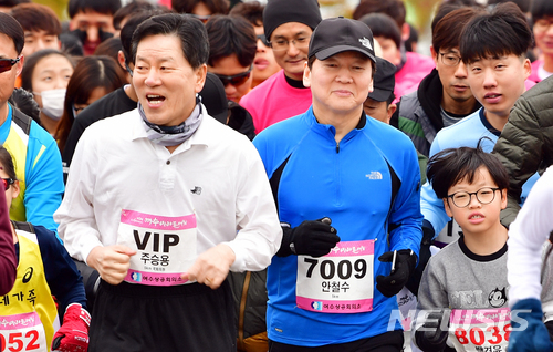 【여수=뉴시스】류형근 기자 = 국민의당 안철수 대표와 주승용 의원이 7일 오전 전남 여수시 여수박람회장에서 열린 '여수마라톤대회'에 참석해 5㎞구간을 달리고 있다. 2018.01.07.
