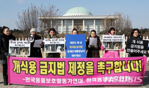 【서울=뉴시스】홍효식 기자 = 11일 오후 서울 여의도 국회 앞에서 전국동물보호활동가연대, 한국동물보호연합 관계자들이 개식용 금지법 제정을 촉구하는 기자회견을 하고 있다. 2018.01.11.