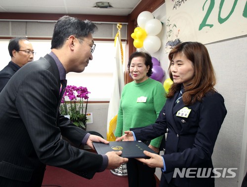 【서울=뉴시스】 11일 이창우(왼쪽) 동작구청장이 서울시 동작구 사당 3동에서 열린 2018 동 업무보고회에 앞서 유공 구민에게 표창장을 전달하고 있다. 2018.01.11. (사진=동작구 제공)