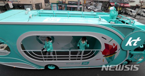 【서울=뉴시스】고범준 기자 = 14일 서울 성동구 인근 거리에서 2018 평창동계올림픽 성화 봉송 행사에 참여한 KT 퍼레이드 차량 행렬이 시민들에게 박수를 유도하고 있다. 2018.01.14.