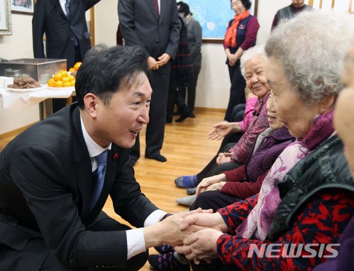 【서울=뉴시스】 15일 이창우 동작구청장이 서울 동작구 사당1동 주민센터에서 열린 2018 동 업무보고회를 마치고 관내 송학경로당을 방문 어르신들을 격려하고 있다. 2018.01.15. (사진=동작구 제공)