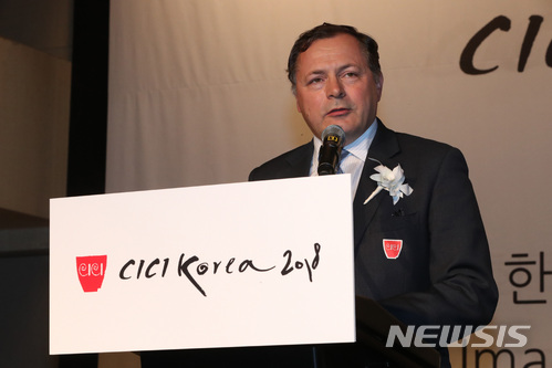 【서울=뉴시스】김선웅 기자 = 16일 오후 서울 강남구 코엑스 인터컨티넨탈 호텔에서 한국이미지커뮤니케이션연구원(CICI)이 주최한 한국이미지상 시상식에서 찰스 헤이 주한 영국대사가 축사를 하고 있다. 2018.01.16.