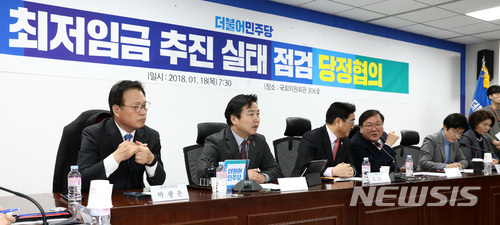 【서울=뉴시스】이영환 기자 = 18일 오전 서울 여의도 국회 의원회관 더불어민주당 정책위회의실에서 열린 최저임금 추진 실태 점검 당정협의에 참석한 홍종학 중소벤처기업부 장관이 모두발언을 하고 있다.