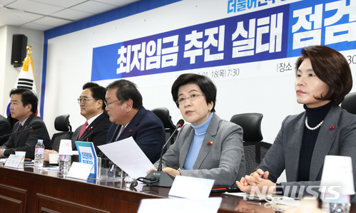 【서울=뉴시스】이영환 기자 = 18일 오전 서울 여의도 국회 의원회관 더불어민주당 정책위회의실에서 열린 최저임금 추진 실태 점검 당정협의에 참석한 김영주 고용노동부 장관이 모두발언을 하고 있다.