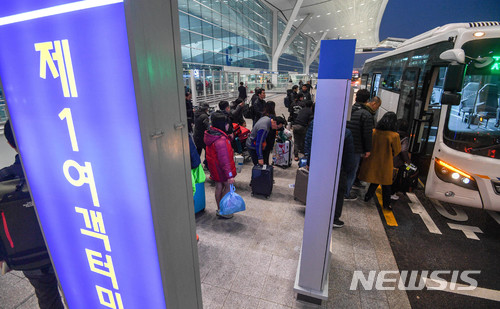 【인천공항=뉴시스】추상철 기자 = 인천국제공항 제2여객터미널이 개항된 18일 오전 인천국제공항 제2여객터미널 출국장에서 이용객이 1여객터미널로 향하는 순환버스에 탑승하고 있다. 2018.01.18.