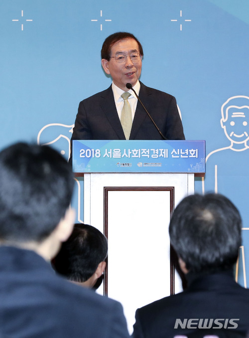 【서울=뉴시스】최진석 기자 = 박원순 서울시장이 2일 오후 서울 용산구 백범김구기념관에서 열린 '2018 서울사회적경제 신년회'에 참석해 인사말을 하고 있다. 2018.02.02.