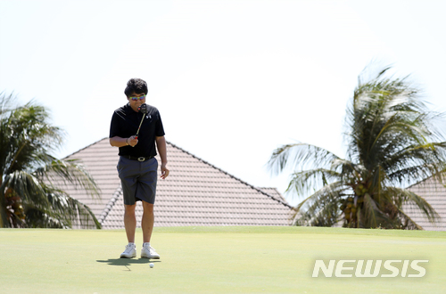 【서울=뉴시스】 4일 베트남 무이네 씨링크 골프 리조트에서 열린 제7회 휴셈챌린지 1라운드에서 주학대표가 3번홀 퍼팅라인을 살펴보고 있다. 2018.02.04. (사진=팀휴셈 제공)