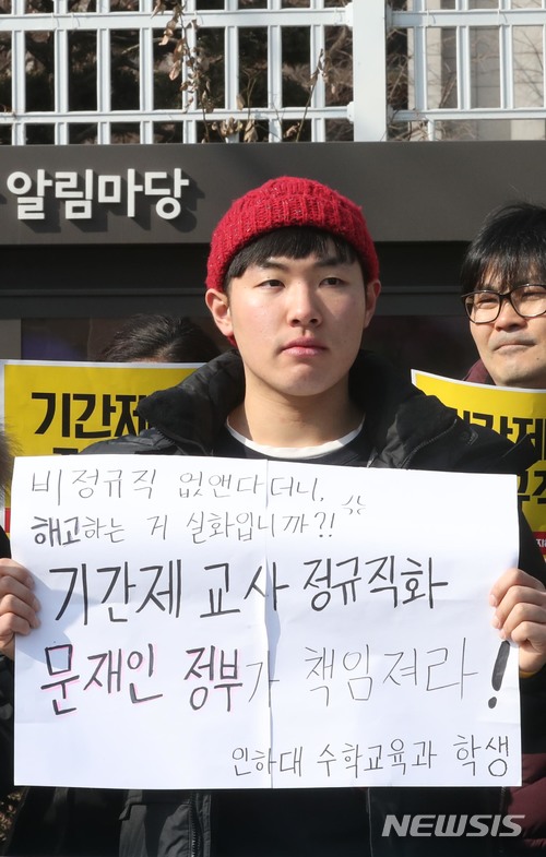 【서울=뉴시스】조성봉 기자 = 21일 오전 서울 종로구 정부서울청사 앞에서 열린 기간제교사 정규직 전환 배제, 해고 규탄 기자회견에서 인하대 수학교육과 한 학생이 기간제 교사 정규직화를 촉구하는 피켓을 들고 있다. 2018.02.21.