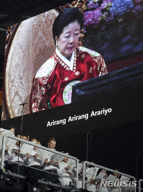 【가평=뉴시스】최진석 기자 = 한학자 세계평화통일가정연합 총재가 21일 경기 가평군 설악면 청심평화월드센터에서 열린 천지인 참부모님 성탄 및 기원절 5주년 행사에서 합창단의 기념축가를 듣고 있다. 2018.02.21.