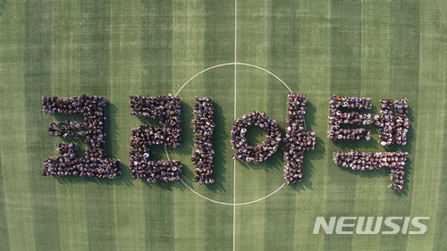 【천안=뉴시스】이종익 기자 = 25일 충남 천안의 코리아텍 2018학년도 신입생 오리엔테이션에서 880명의 신입생들이 운동장에 모여 '코리아텍' 글자를 형상화하고 있다. 코리아텍은 드론으로 촬영한 이 사진을 신입생 학부모들에 보낼 '희망편지' 등에 활용할 계획이다. 2018.02.26. (사진=코리아텍 제공)