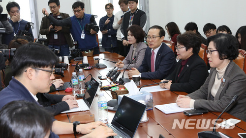 【서울=뉴시스】박영태 기자 = 27일 서울 영등포구 여의도 국회 환노위 소회의실에서 진행된 근로시간단축 법안통과관련 환노위원장과 3당간사 기자간담회에서 홍영표 위원장이 발언을 하고 있다. 왼쪽부터 한정애 더불어민주당 간사, 홍영표 환노위원장, 임이자 자유한국당 간사, 김삼화 바른미래당 간사. 2018.02.27.