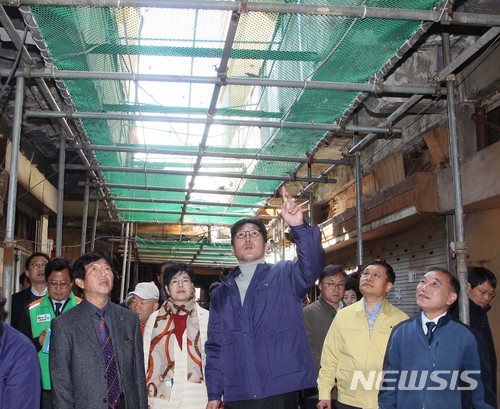 【서울=뉴시스】 5일 이창우 동작구청장이 서울시 동작구 노량진2동 주민들과 함께 재난취약 지역인 신노량진시장을 찾아 사고를 예방하기 위한 안전그물방설치 작업 현장을 점검하고 있다. 2018.03.05. (사진=동작구 제공)