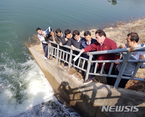 【밀양=뉴시스】김기진 기자 =한국농어촌공사 경남지역본부(본부장 강병문)와 경상남도 농해양수산위원회 예상원 위원장 등 관계자들은 합동으로 경남 밀양시 마흘저수지를 방문해 농업용수 급수대책 현장 및 추진사항을 점검하고 있다. 2018.03.13. (사진=농어촌공사 경남본부 제공)