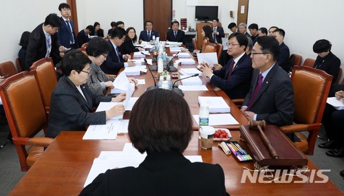 【서울=뉴시스】홍효식 기자 = 13일 오후 서울 여의도 국회 본청 환경노동위원회 소회의실에서 열린 환경소위원회에서 한정애 소위원장이 회의를 주재하고 있다. 2018.03.13.