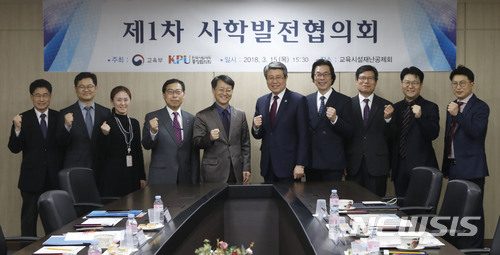 【서울=뉴시스】최동준 기자 = 15일 서울 영등포구 교육시설공제회관에서 열린 제1차 사학발전협의회에서 공동위원장인 김성익(왼쪽 여섯번째) 삼육대학교 총장, 이진석(왼쪽 다섯번째) 교육부 고등교육정책실장을 비롯한 위원들이 기념촬영을 하고 있다. 2018.03.15.