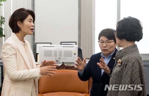 【서울=뉴시스】 박영태 기자 = 임이자 국회 환경노동소위원장과 한정애 더불어민주당 간사, 김삼화 바른미래당 간사가 16일 국회 환경노동위원장에서 의견을 나누고 있다.