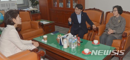 【서울=뉴시스】 박영태 기자 = 16일 오전 국회에서 열린 환경노동위원회 고용노동소위원회에서 임이자(가운데)소위원장과 한정애(왼쪽) 민주당 간사와 김삼화 바른미래당 간사가 법안 조율을 하고 있다. 2018.03.16.