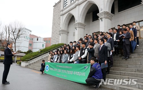 【서울=뉴시스】 19일 서울 노원구 삼육대학교에서 김성익 총장과 각부 처장, 총학생회, 교수, 직원 등이 참석한 가운데 ‘성희롱·성폭력 근절을 위한 실천 선언식’이 열리고 있다.