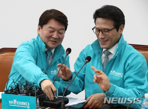【서울=뉴시스】홍효식 기자 = 바른미래당 안철수(왼쪽) 인재영입위원장이 21일 오전 서울 여의도 국회에서 열린 제5차 최고위원·중진의원 연석회의에 참석해 정병국 의원에게 마이크를 전달하고 있다. 2018.03.21.