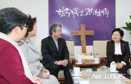 【서울=뉴시스】 정현백 여성가족부 장관이 21일 오후 서울 종로구 한국기독교교회협의회에서 이홍정 한국기독교교회협의회 총무를 예방, 여성·청소년·가족의 권익향상을 위한 정책을 설명하고 With You 캠페인에 대한 협조를 요청하고 있다. 2018.03.21. (사진=여성가족부 제공)