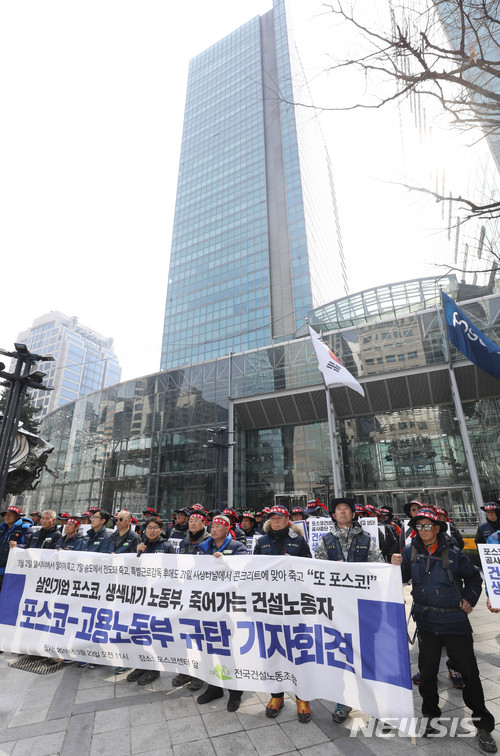 건설노조는 3월 중 포스코건설 현장에서만 6명의 건설노동자가 목숨을 잃었다고 밝히며, 포스코건설 전 현장에서 제대로 된 특별감독을 실시하고 안전대책이 수립될 때 까지 공사재개를 하지 않을 것을 촉구했다. 2018.03.23.