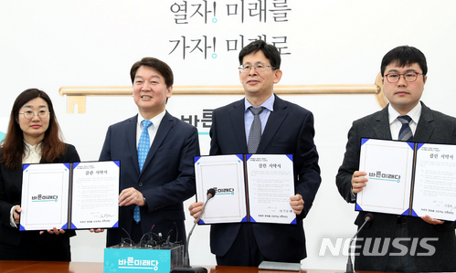 【서울=뉴시스】이종철 기자 = 안철수 바른미래당 인재영입위원장이 25일 서울 여의도 국회에서 열린 인재영입 발표식에서 구의원에 출마하려는 왼쪽부터 정수경, 서진웅, 조용술과 클린서약서를 들고 포즈를 취하고 있다. 2018.03.25.