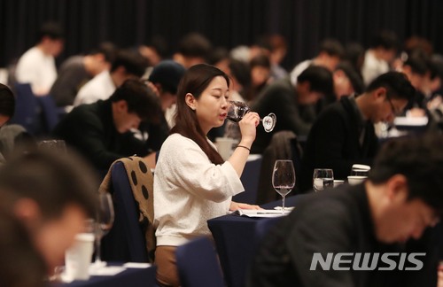 【서울=뉴시스】조성봉 기자 = 28일 오전 서울 중구 밀레니엄 서울 힐튼 그랜드볼룸에서 열린 제17회 한국 소믈리에 대회 1차 예선에서 참가자들이 시험문제로 나온 와인을 테스팅하고 있다. 2018.03.28.