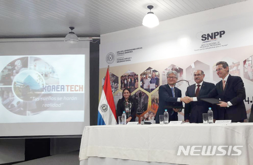 【천안=뉴시스】이종익 기자 = 충남 천안의 코리아텍 김기영 총장(왼쪽 첫번째)이 4일 오후(현지 시각) 파라과이 직업훈련청(SNPP)을 방문해 직업훈련교사 기술연수 프로그램 개발, 전문가 인적교류 확대 등을 내용으로 한 협약(MOU)을 체결했다. 2018.04.05. (사진=코리아텍 제공)