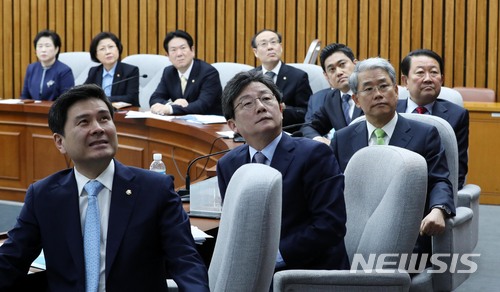 【서울=뉴시스】홍효식 기자 = 바른미래당 박주선, 유승민 공동대표 등이 5일 오전 서울 여의도 국회에서 열린 제8차 의원총회에 참석해 더불어민주당 박홍근 원내수석부대표가 언론장악방지법을 통과시켜야한다고 주장했던 영상을 바라보고 있다.