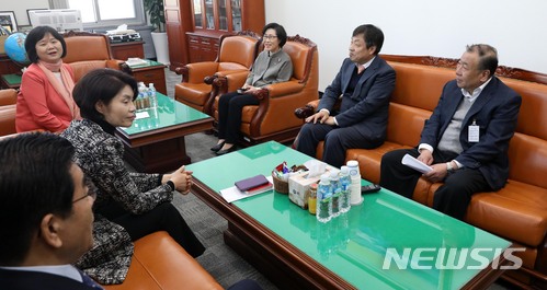 【서울=뉴시스】홍효식 기자 = 11일 오전 서울 여의도 국회 본청 환경노동위원회 소회의실에서 최저임금법 개정 관련 의견 청취의 건 관련 고용노동소위원회가 열리기 앞서 자유한국당 문진국(왼쪽부터), 더불어민주당 한정애, 정의당 이정미, 바른미래당 김삼화 의원과 어수봉(맨 오른쪽) 최저임금위원장이 회의 시작을 기다리며 대화를 나누고 있다. 2018.04.11.