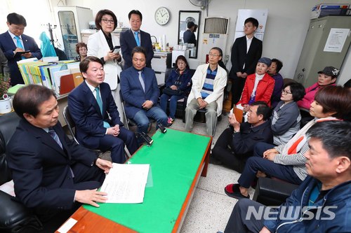 【서울=뉴시스】전신 기자 = 바른미래당 안철수 서울시장 예비후보가 12일 서울 서대문구 홍제청구3차아파트 관리사무소를 방문해 주민들과 주택주거 문제와 관련한 의견을 나누고 있다. 2018.04.12.