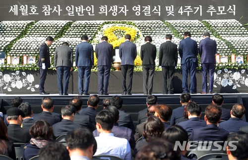 【인천=뉴시스】배훈식 기자 = 세월호 참사 4주기인 16일 오후 인천 부평구 인천가족공원에서 열린 '세월호 참사 일반인 희생자 영결식 및 4주기 추모식' 참석자들이 분향하고 있다. 2018.04.16.