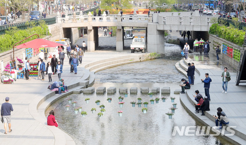 【서울=뉴시스】배훈식 기자 = 19일 오후 서울 종로구 청계천 모전교와 광통교 사이 청계천 인근 기업·기관 봉사단체 '청계아띠' 회원들이 조성한 쌈지공원에서 시민과 관광객들이 봄 기운을 만끽하고 있다. 2018.04.19.