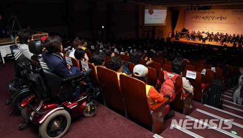 【서울=뉴시스】홍효식 기자 = 20일 오후 서울 여의도 국회 의원회관에서 열린 '제38회 장애인의 날' 기념 서울장애인합창예술제에서 국장협나눔체임버오케스트라가 축하공연을 하고 있다. 2018.04.20.