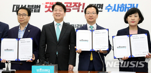 【서울=뉴시스】박영태 기자 = 1일 오전 서울 영등포구 여의도 국회에서 진행된 바른미래당 인재영입 발표에서 안철수 서울시장 후보가 새로 영입된 인사들과 클린선거 서약서를 쓰고 기념촬영을 하고 있다. 왼쪽부터 이근옥, 안철수 서울시장 후보, 천강정, 양건모. 2018.05.01.