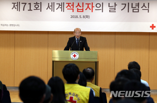 【서울=뉴시스】조성봉 기자 = 8일 오전 서울 중구 대한적십자사 앙리뒤낭홀에서 열린제71회 세계적십자의 날 기념식에서 박경서 회장이 기념사를 하고 있다. 2018.05.08.