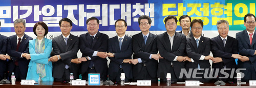 【서울=뉴시스】박영태 기자 = 14일 오전 서울 영등포구 여의도 국회 의원화관에서 진행된 민간일자리대책 당정협의에서 홍영표 원내대표와 이목희 일자리위원회 부위원장 등 참석자들이 기념촬영을 하고 있다. 왼쪽 두번째부터 한정애, 조정식 의원, 김태년 정책위의장, 홍영표 원내대표, 이목희 일자리위원회 부위원장, 홍익표, 김정우 의원. 2018.05.14.