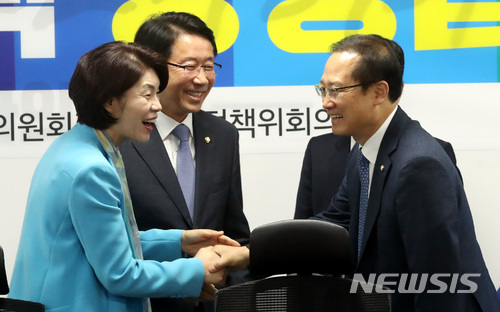 【서울=뉴시스】박영태 기자 = 14일 오전 서울 영등포구 여의도 국회 의원화관에서 진행된 민간일자리대책 당정협의에 참석한 홍영표 원내대표가 한정애 의원과 악수를 하고 있다. 가운데는 조정식 의원. 2018.05.14.