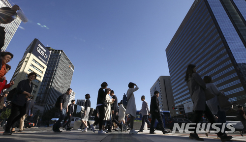 【서울=뉴시스】최진석 기자 = 징검다리 연휴인 21일 오전 서울 광화문 네거리에서 출근길 발걸음을 재촉하는 직장인들 뒤로 미세먼지 없이 맑은 파란 하늘이 보이고 있다. 2018.05.21.