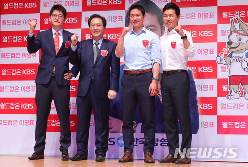 【서울=뉴시스】배훈식 기자 = 24일 오전 서울 여의도 KBS아트홀에서 열린 2018 러시아 월드컵 기자간담회에 참석한 이재후(왼쪽부터) 캐스터, 한준희, 이영표 해설위원, 이광용 캐스터가 포즈를 취하고 있다. 2018.05.24.