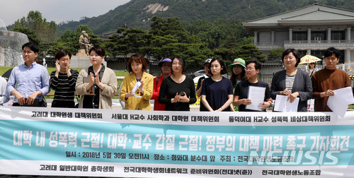 【서울=뉴시스】 추상철 기자 = 전국대학생원생노동조합이 30일 오전 서울 종로구 청와대 분수대 앞에서 '대학 내 위계형 성폭력 근절, 대학 교수 갑질 근절, 정부의 대책 마련 촉구' 기자회견을 하고 있다.  2018.05.30.