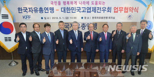 【서울=뉴시스】 1일 서울 중구 한국자유총연맹 회의실에서 열린 한국자유총연맹-대한민국고엽제전우회 업무협약 체결식에 참석한 한국자유총연맹 박종환 총재와 대한민국고엽제전우회 황규승 회장이 협약 체결 후 참석자들과 기념촬영을 하고 있다. 2018.06.01. (사진=한국자유총연맹 제공)