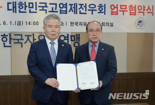 【서울=뉴시스】 1일 서울 중구 한국자유총연맹 회의실에서 열린 한국자유총연맹-대한민국고엽제전우회 업무협약 체결식에 참석한 한국자유총연맹 박종환 총재와 대한민국고엽제전우회 황규승 회장이 협약 체결 후 기념촬영을 하고 있다. 2018.06.01. (사진=한국자유총연맹 제공)