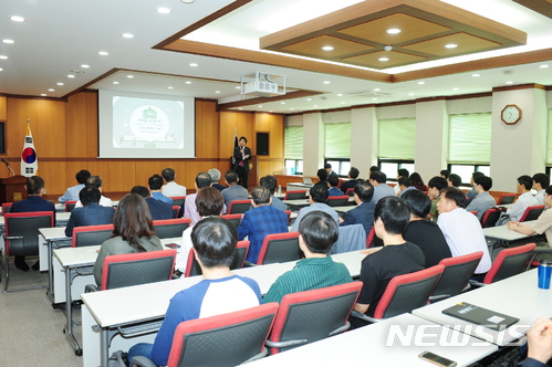 【천안=뉴시스】이종익 기자 = 충남 천안의 코리아텍(총장 김기영)은 8일 오후 교내에서 건국대학교(총장 민상기)와 교과·비교과 영역 공동 교육프로그램을 개발, 운영 등을 위한 업무협약을 체결했다. 이날 민상기 건국대 총장이 업무협약 체결후 코리아텍 교직원 대상으로 특강을 하고 있다. 2018.06.09. (사진=코리아텍 제공)